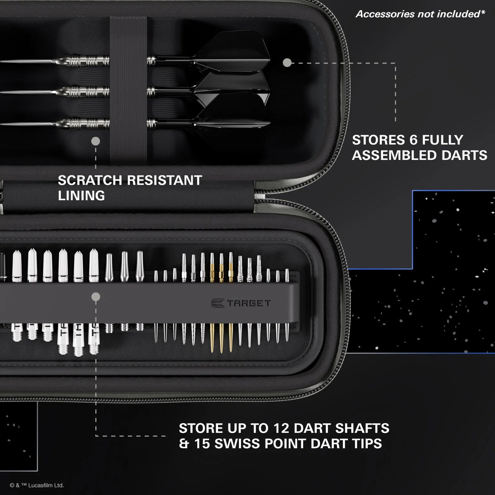 Featuring R2-D2’s iconic white, blue, and silver, the wallet perfectly captures his personality while providing practical organisation. Designed to hold 6 fully assembled darts, it includes an internal tray system for 12 shafts and 15 Swiss Point tips—making it the only dart wallet in the galaxy with dedicated Swiss Point storage. Additional compartments house flights, K-Flex accessories, and tools, keeping your setup mission-ready wherever you play.
