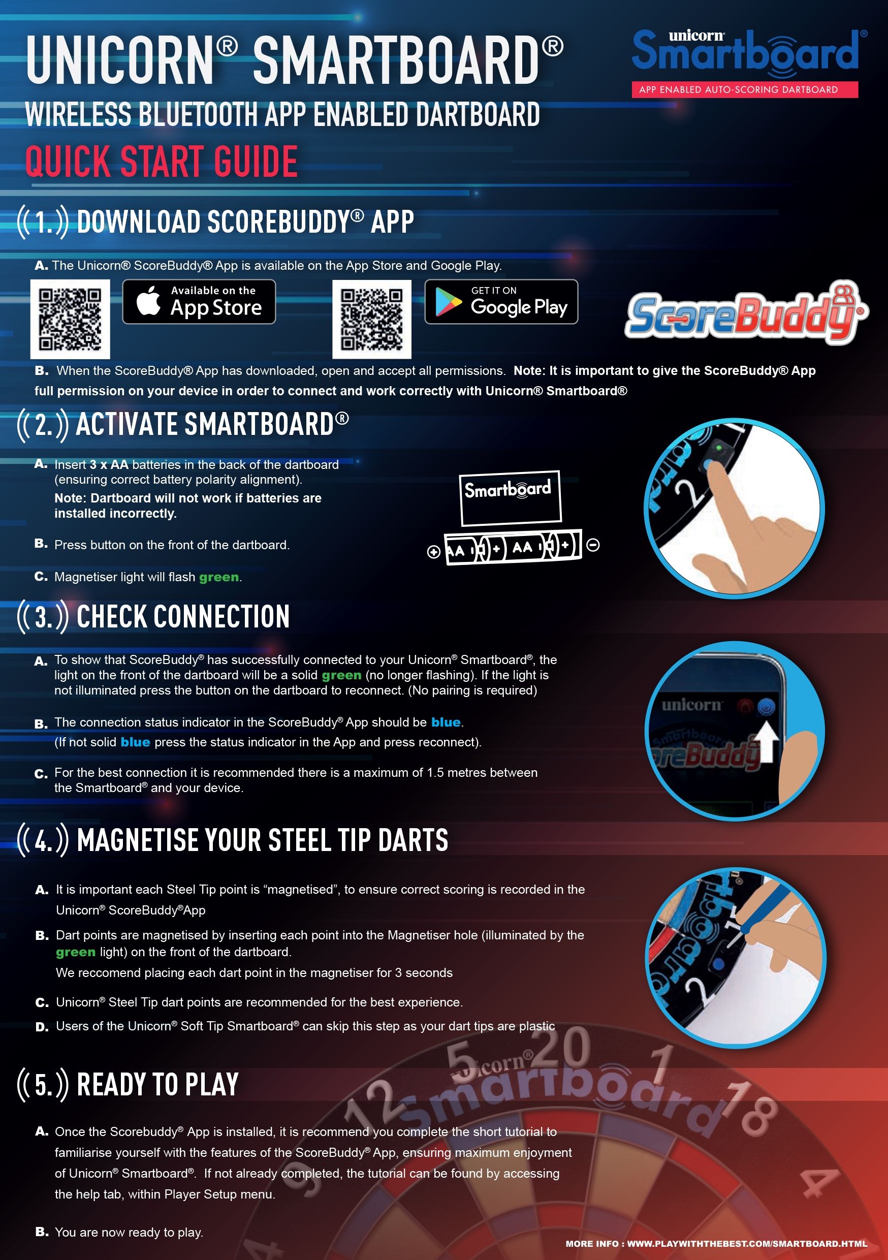 The new Unicorn Smartboard is the world’s first app-enabled auto-scoring dartboard. With instant scoring, made possible by the amazing Unicorn Scorebuddy app. You can play 6 exciting games suitable for all ability levels. Either social or professional, it’s darts re-invented to be fun for everyone!