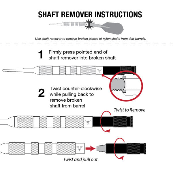 Don’t let a broken shaft ruin your cherished barrels. When a shaft breaks at the thread while it’s screwed in it can be nearly impossible to remove, rendering them useless. However the Viper Broken Shaft Remover allows you to save your barrels and allow them to live another day. This easy to use tool grips the broken piece of shafts embedded in the barrel and allows you to remove it, extending your darts life.