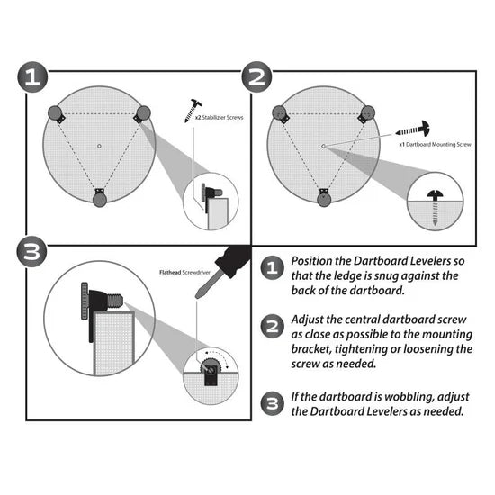Level and secure your dartboard with ease using the Viper Dartboard Leveler Kit. Each kit comes with three leveler wheels for pinpointed adjustments on almost any uneven wall surface, including brick and stone. Simply attach the levelers to your dartboard and use a screwdriver to turn the wheels to adjust their height. Lock your dartboard in place for maximum stability. Forged from enduring polymer compounds, the shock-proof hardware will absorb the force of even the most heavy-duty darts. Never worry about a wobbly board again with these long-lasting, reusable levelers. When it’s time to upgrade your board, simply remove the levelers and apply them to the new board.